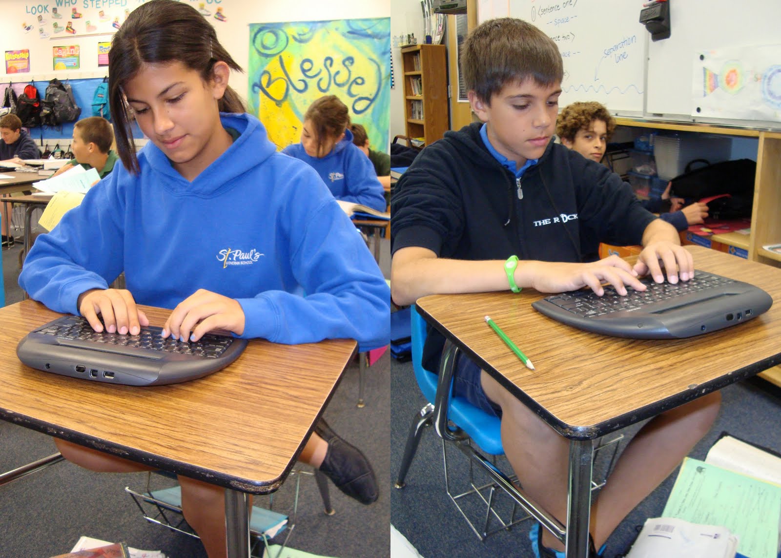 Another use of technology that all of the 6th grade students have experienced this year and are very comfortable using are the Neo2 Laptops. These devices are great for writing prompts, taking notes, quizzes, and more! Below, Kendall and Jake use their skills to complete a writing prompt for Health class.